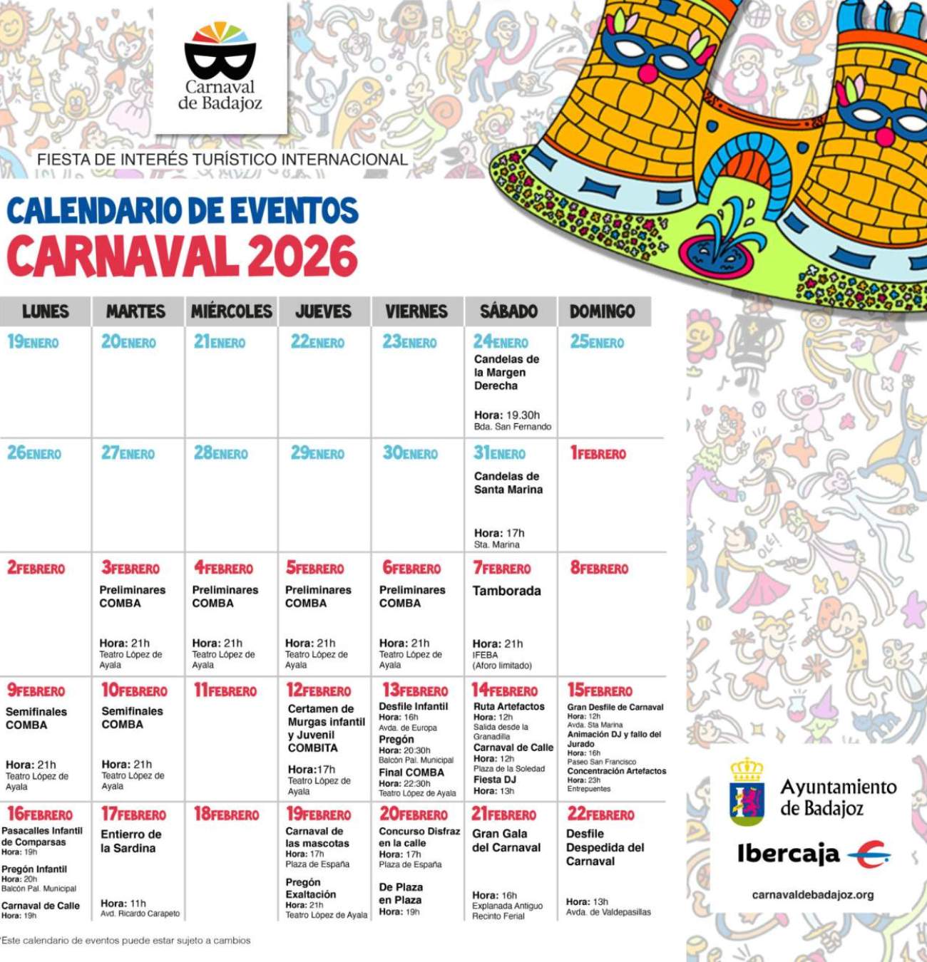 El Concurso Oficial de Murgas de Badajoz (COMBA) y los desfiles de comparsas son, como cada año, los grandes protagonistas de la programación competitiva, con fases de preliminares, semifinales y finales que llenan de música y sátira los espacios festivos.