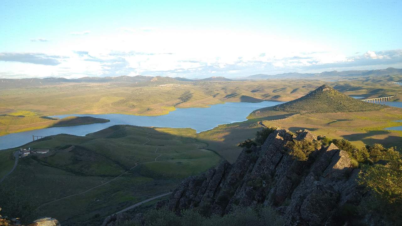 Hoy, su cima ofrece varios miradores con vistas panorámicas brutales: el embalse infinito, las sierras lejanas, pueblos como Puebla de Alcocer al fondo y horizontes que se pierden en dehesas y agua. Hay rutas senderistas fáciles y circulares (como la SL-BA 198 Senda de Masatrigo, de unos 4-5 km, apta para familias y MTB), con subidas moderadas que recompensan con silencio, viento y esa sensación de estar en el centro del mundo.