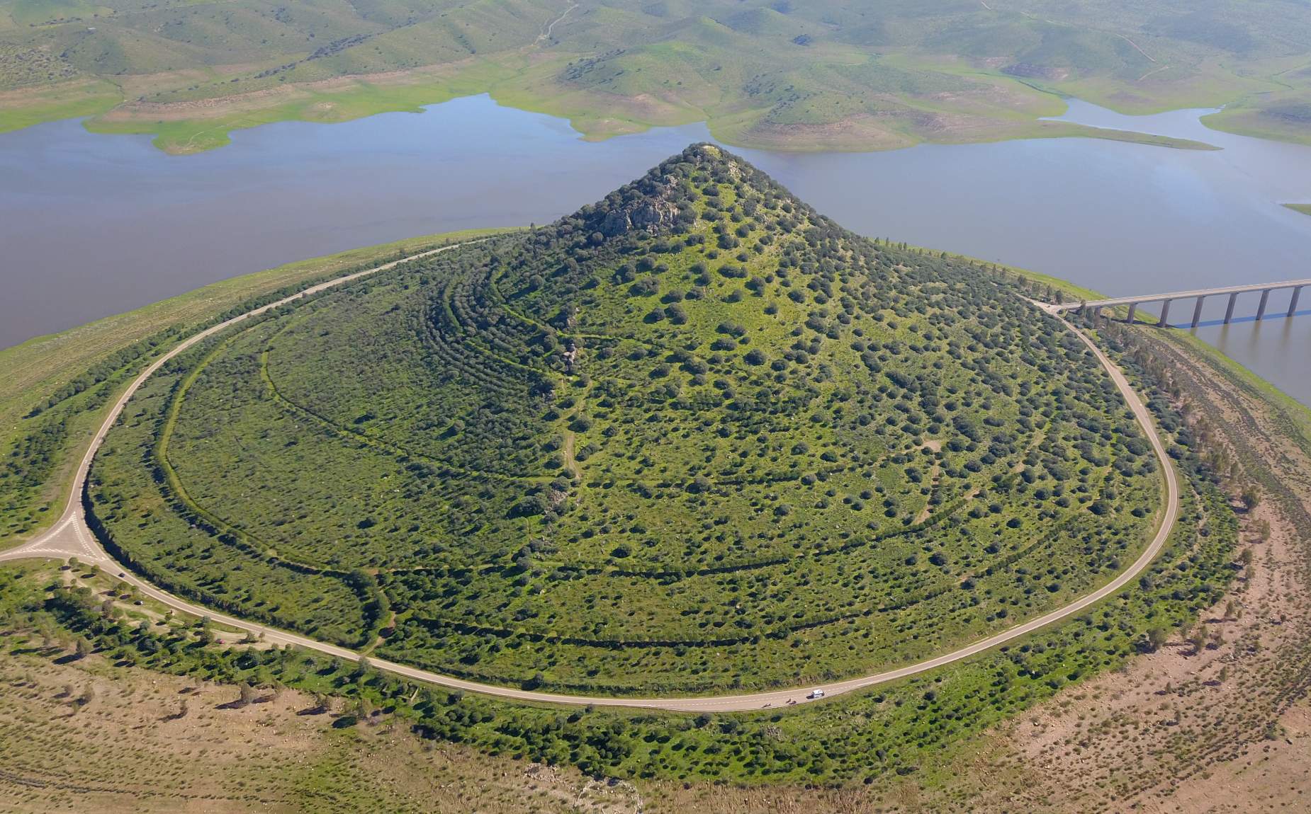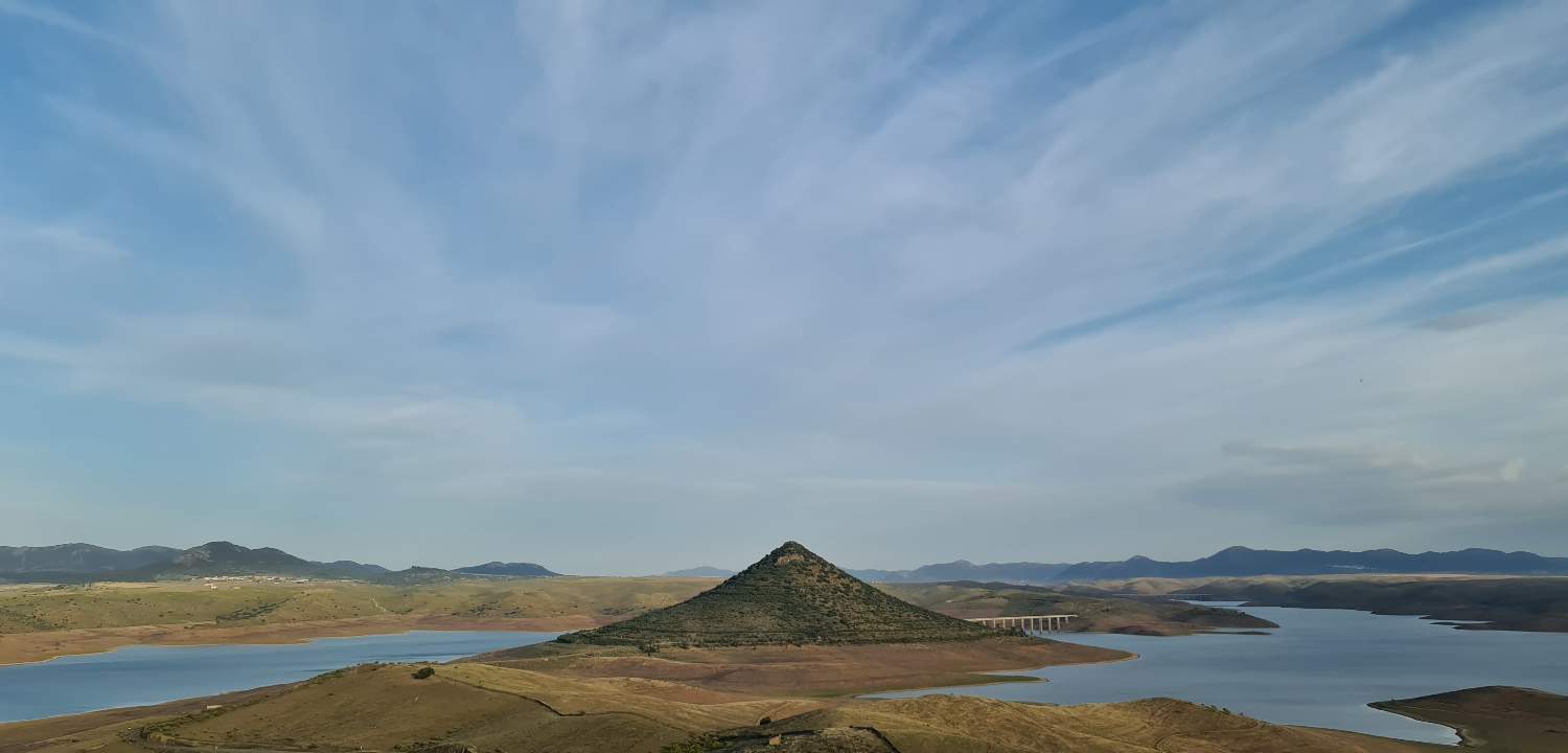 En el corazón de La Siberia Extremeña, donde el embalse de La Serena —el más extenso de España— dibuja un mar interior de aguas dulces, emerge el Cerro Masatrigo como un capricho geológico imposible: una colina cónica casi perfecta que parece una isla flotante o una "montaña mágica" sacada de un sueño.