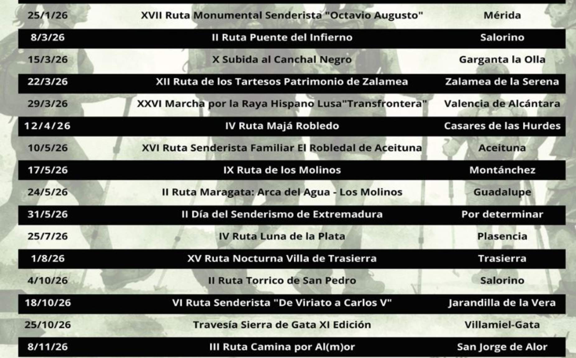 El circuito, que arrancó el 25 de enero en Mérida y se desarrollará hasta el 13 de diciembre, contempla 19 pruebas distribuidas por toda la comunidad autónoma. La programación combina itinerarios ya consolidados con nuevas propuestas, marchas familiares, travesías de largo recorrido, rutas nocturnas y una actividad inclusiva, reforzando así su carácter participativo y accesible.