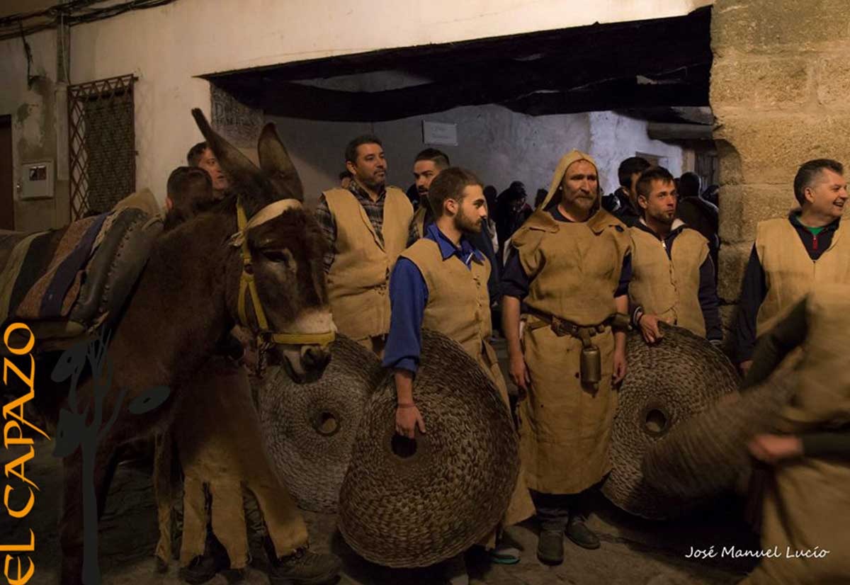 Son las mujeres con sus cánticos, bailes y vítores al son del tamboril las encargadas de despertarlo, para acompañarlo por las calles del pueblo. El Camuñas, con su baile y el sonar de los cencerros avisa y recoge a los capaceros en las diferentes calles ataviados éstos como los antiguos molineros: sacos abiertos y chalecos de fardo. Durante este recorrido, los bodegueros ofrecerán vino y viandas a la comitiva y visitantes en la Ruta por las Bodegas con los afamados caldos de la Sierra de Gata. Durante este recorrido será El Camuñas el encargado de entregar las capacetas (utilizadas para prensar la aceituna en los molinos y que se encuentran impregnadas de aceite) a los capaceros para ser quemadas posteriormente en la plaza.