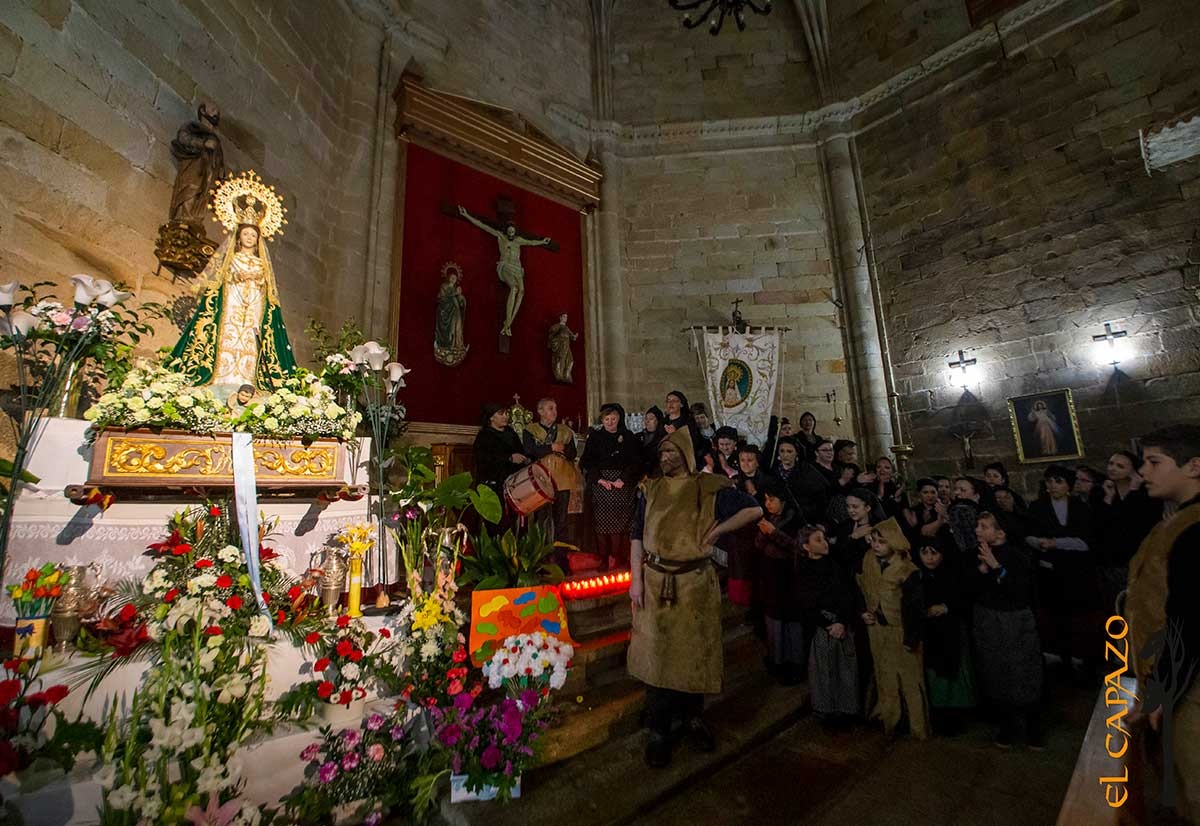 De las llamas caídas, los mozos prenden los cirios que llevarán a la iglesia para depositarlos a los pies de la Virgen: a ella le corresponde la misión de iluminar y fertilizar los campos para que la próxima cosecha resulte abundante. Silencio que solo se rompe con la Salve a la Virgen de Bienvenida.