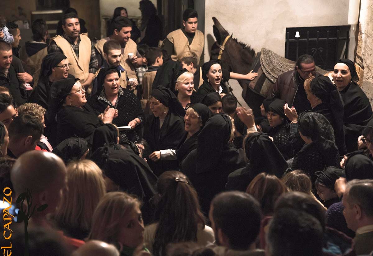 Los capaceros, mujeres y niño/as bailan al son del tamboril del muñidor, siguiendo siempre los pasos de El Camuñas que, al saltar, hace sonar los cencerros, extendiendo su llamada hasta el último rincón del pueblo.