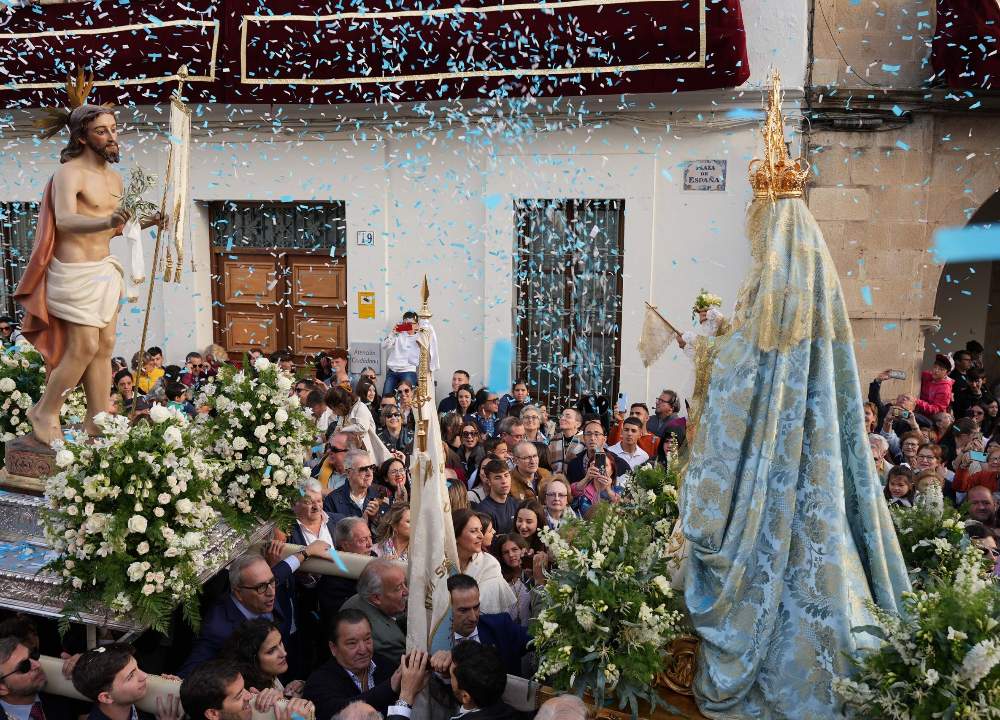 Tras el reencuentro de las dos imágenes, la celebración continúa con una procesión conjunta que recorre la plaza y calles cercanas, acompañada de vítores, aplausos y pétalos de flores lanzados por el público.