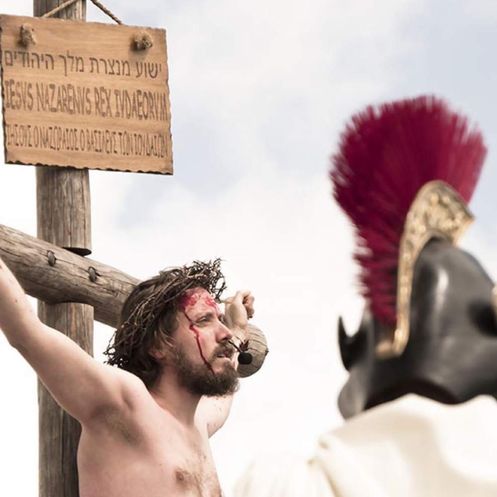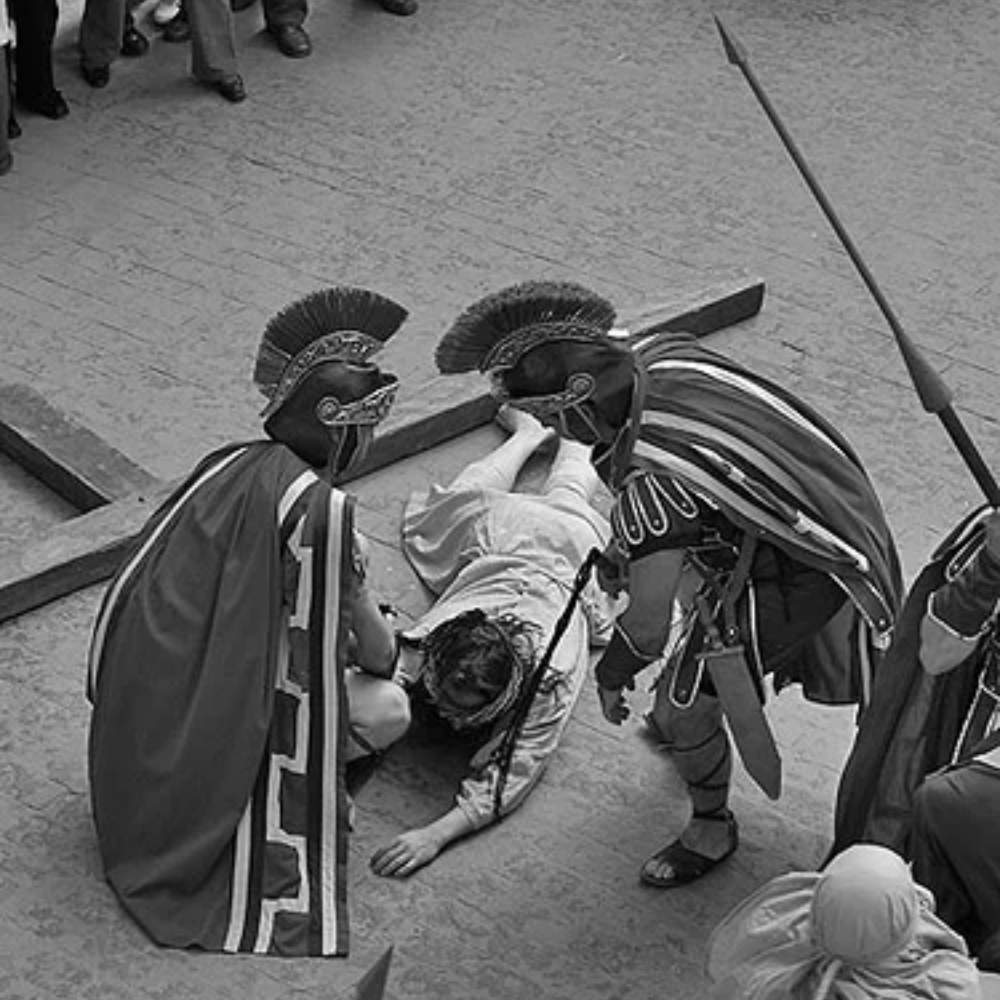 El Viernes Santo, Jesús es juzgado, condenado y recorre las calles cargando la cruz, acompañado por el pueblo, soldados romanos y personajes como Simón de Cirene o la Verónica, hasta culminar con la Crucifixión y el Descendimiento en el atrio del santuario.