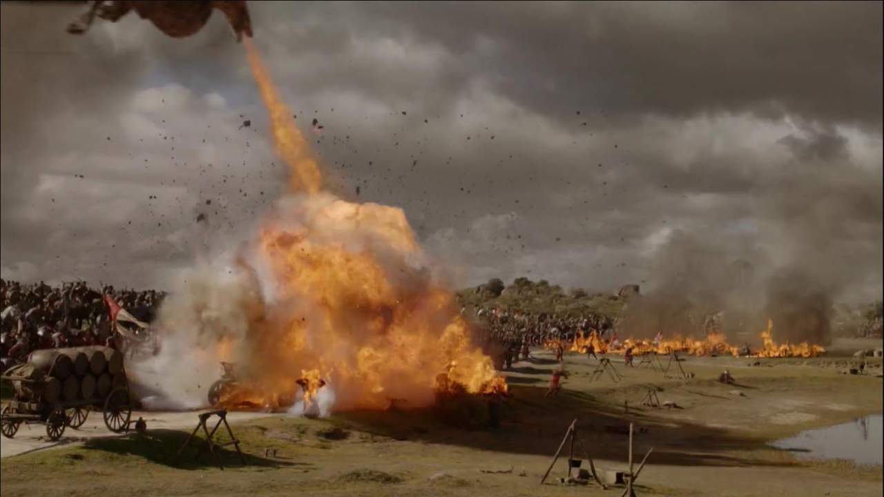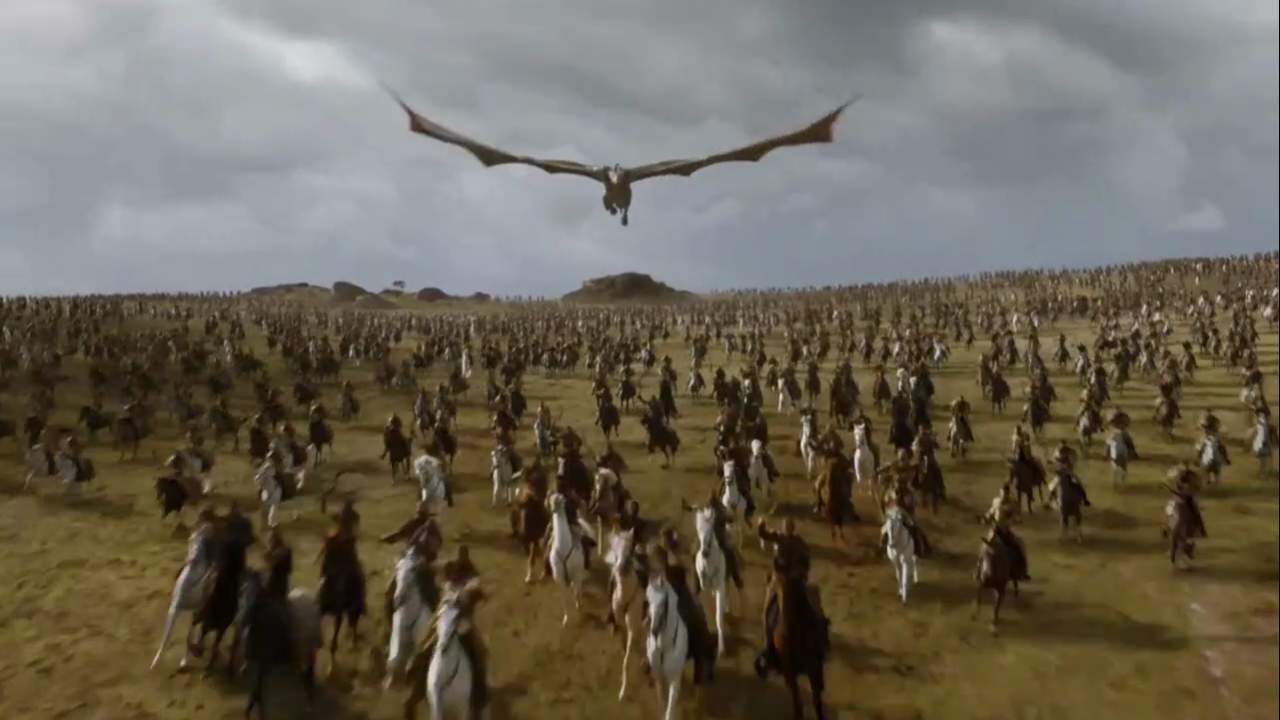 La horda de dothraki a caballo y Drogon en el aire atacan a las tropas Lannister y Tarly, quemándolas sin piedad.
