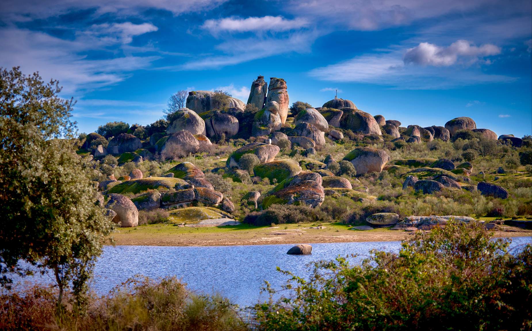 En el fondo de la escena, se puede apreciar la Peña del Miradero, una gran roca de granito de Los Barruecos.