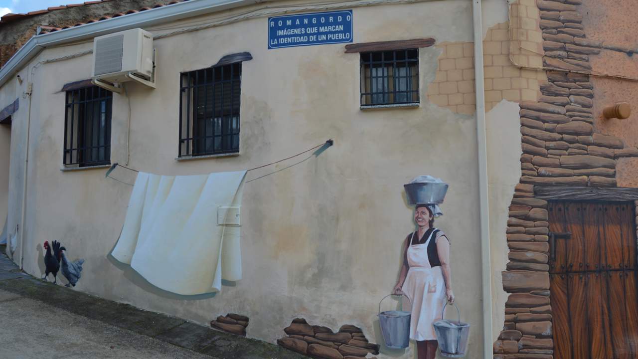 Desde 2016, las calles, fachadas y puertas de Romangordo están decoradas con decenas de pinturas murales que utilizan la técnica del trampantojo para representar escenas de la vida cotidiana, oficios tradicionales, costumbres y la memoria colectiva del pueblo.