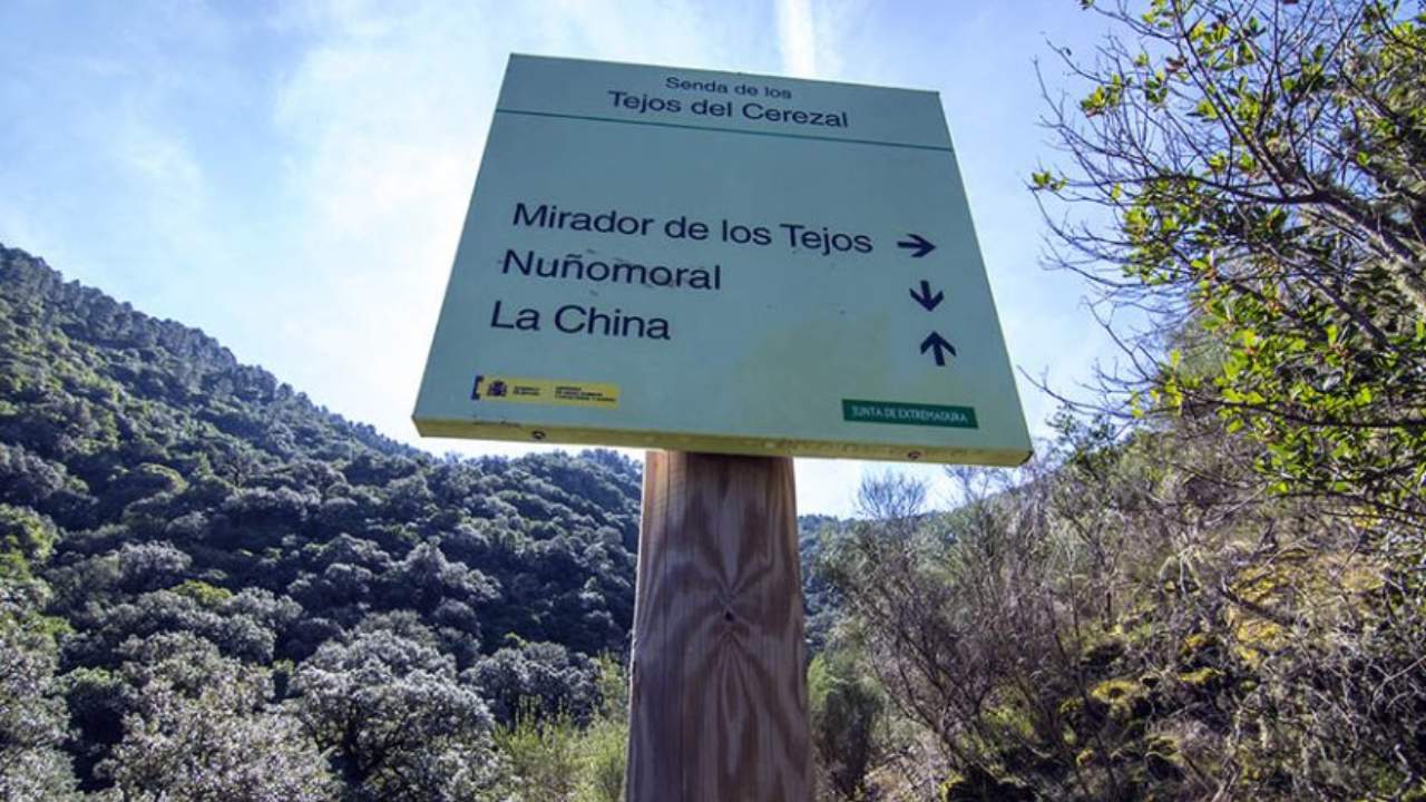 El mejor ejemplo se encuentra en la cabecera del Arroyo del Cerezal, en Nuñomoral, donde 56 tejos adultos y más de un centenar de jóvenes forman parte de un bosque espectacular de encinas y madroños, acompañado de acebos, brezo, cerezos silvestres y helechos.