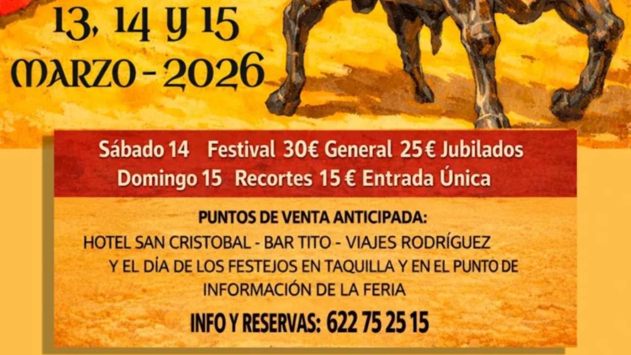El festival taurino con picadores se celebrará el sábado 14 de marzo de 2026 a las 16:30 horas, con la participación del rejoneador extremeño Leonardo Hernández y los matadores Diego Urdiales, Manuel Escribano, Rafael Cerro y Ginés Marín, además del novillero cauriense Jorge Hurtado.